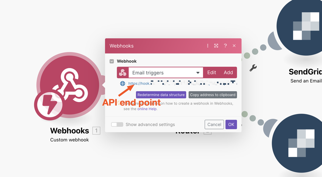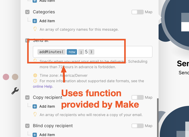 To ensure that this email gets sent 5 minutes after the webhook is called, I used the advanced settings in the Sendgrid module to add a delay to the email sending.