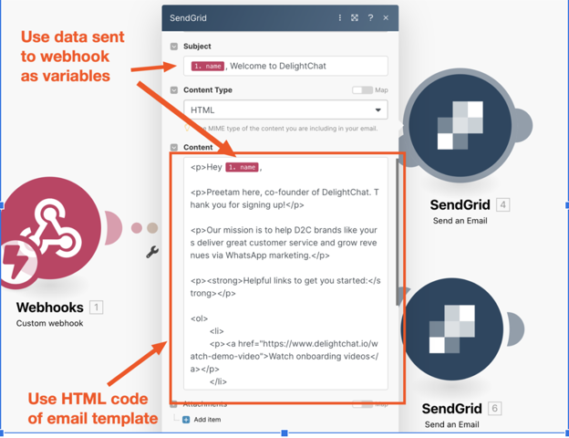 I then repeated the same process for the second email. All I had to do was clone the above sendgrid module and simply replace the email content and sending delay.