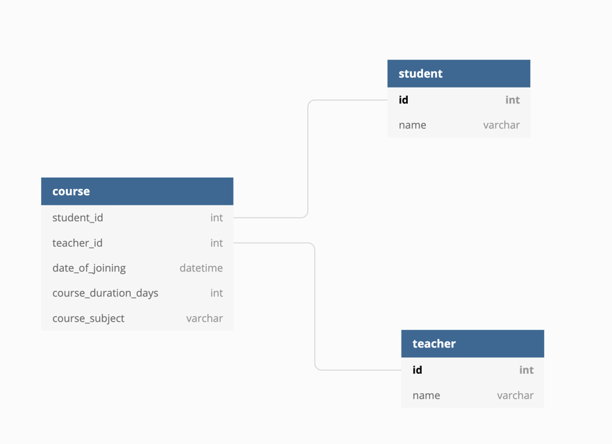 To sum this up, we require a “course” table that not only connects a student and a teacher but also holds this extra information.