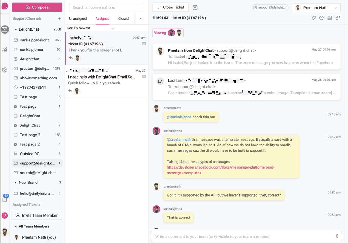 Confused? Here is how it went down. A customer of ours reported an issue via email. We received this email within the DelightChat interface where Preetam and I had an internal discussion on how this problem can be solved and then Preetam replied back to the customer within DelightChat itself.