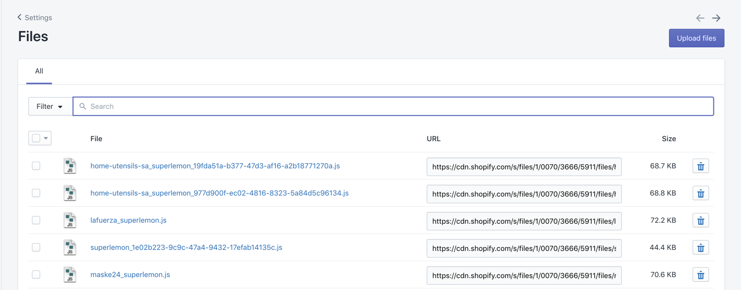 There is a glaring drawback to this approach. The Shopify store CDN does not provide an API that you can use to programmatically upload files and it has to be done manually. Also unlike CloudFront, there is no option of invalidating a file once it is uploaded. So If you have to make updates to your file you would have to upload a new file and migrate all of your existing users to this new file.