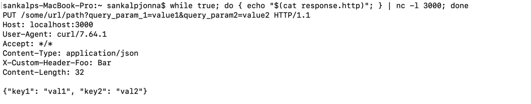 Now when you make a request to localhost:3000, the request content will be displayed on the terminal and a response will be sent to the client making the request but the netcat server will continue to run and accept new requests.