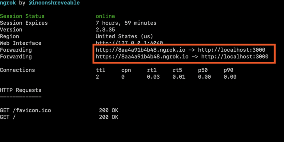 You instantly get a http and https endpoint that routes traffic from the public internet to localhost:3000. You can try it out by coping the generated URL and pasting it in your browser.